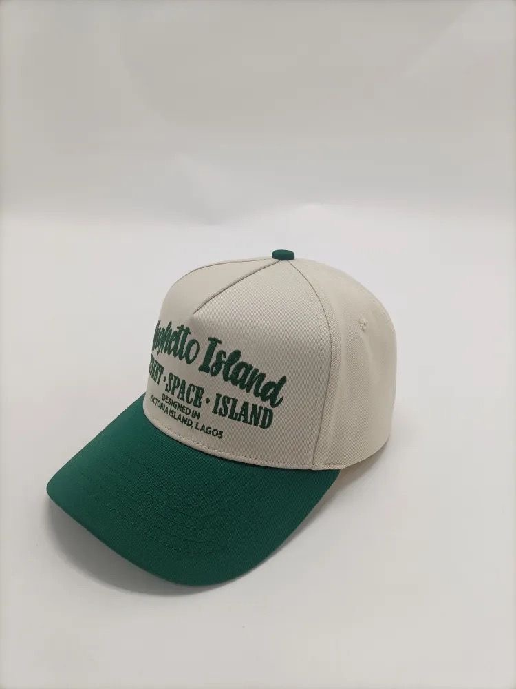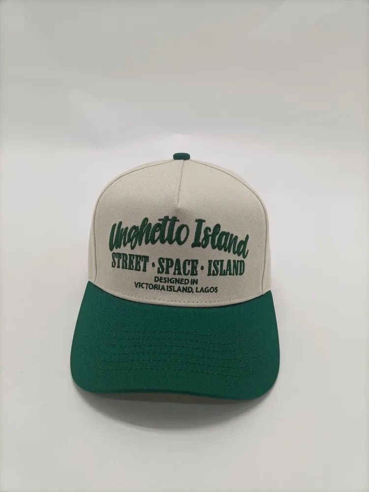 The Unghetto Paradise Cap blends street-style aesthetics with island vibes, celebrating the essence of Unghetto Island. Featuring a bold “Street · Space · Island” tagline embroidered on the front, this two-tone cap is designed for comfort and statement-making style. The creamy upper contrasts perfectly with the green brim, giving it a timeless yet contemporary look. Designed in Victoria Island, Lagos, it’s a nod to those who seek paradise both in the streets and beyond.